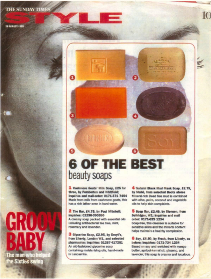The Sunday Times Style Magazine (UK) featured our Dead Sea Mud Mask Soap among the Top 6 Beauty & Skincare Soaps, praised for its deep-cleansing minerals and rejuvenating natural properties.